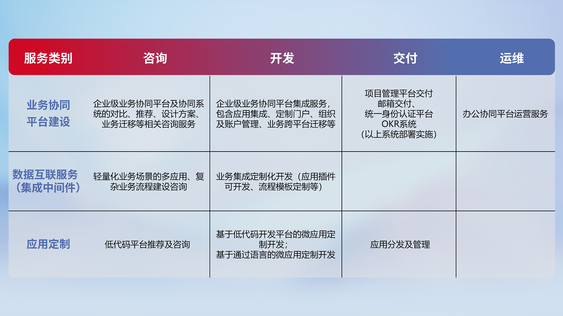 针对钉钉、、、企微、、、、IDaas等平台级产品提供产品的规划、、、、方案、、、、交付、、、、定制化开发等服务,,实现如统一协同办公、、、智能客户服务、、混合会议管理、、、智能数据查询、、、等业务场景,,,,实现数字化转型。。